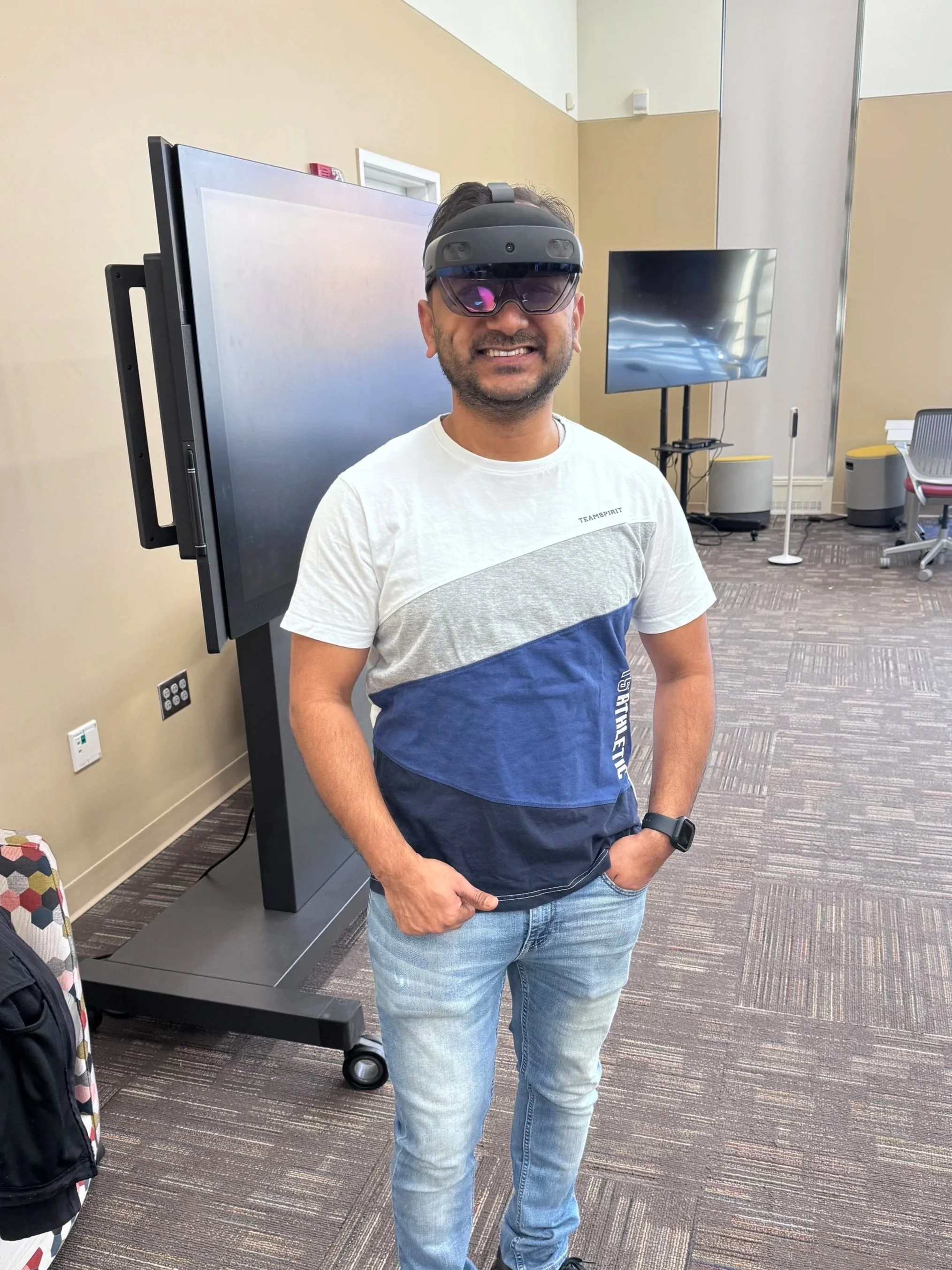 Nehal using HoloPolymer with the Microsoft HoloLens — allowing him to view a Langevin dynamics simulation of a polymer chain in mixed reality.