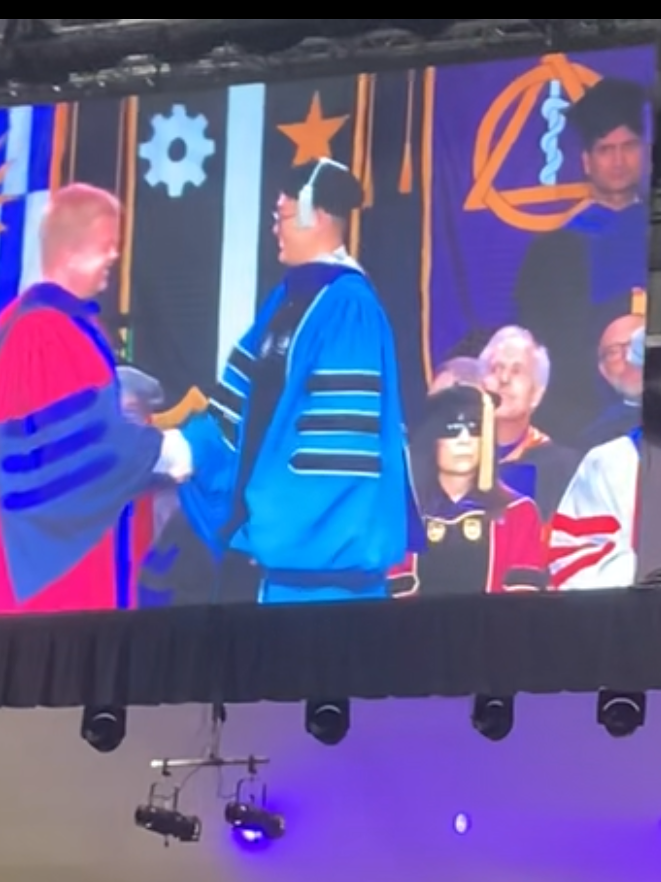 MJAH and Yuan Wei on the big screen during the May 2025 graduate degree ceremony.